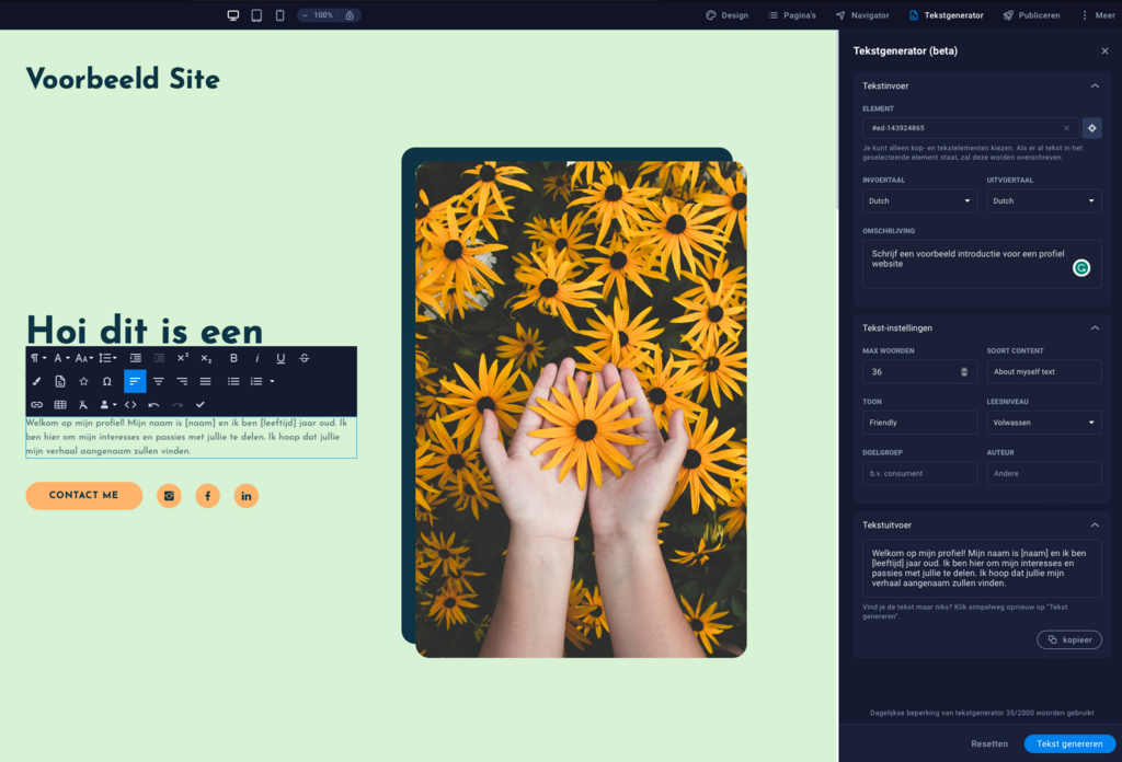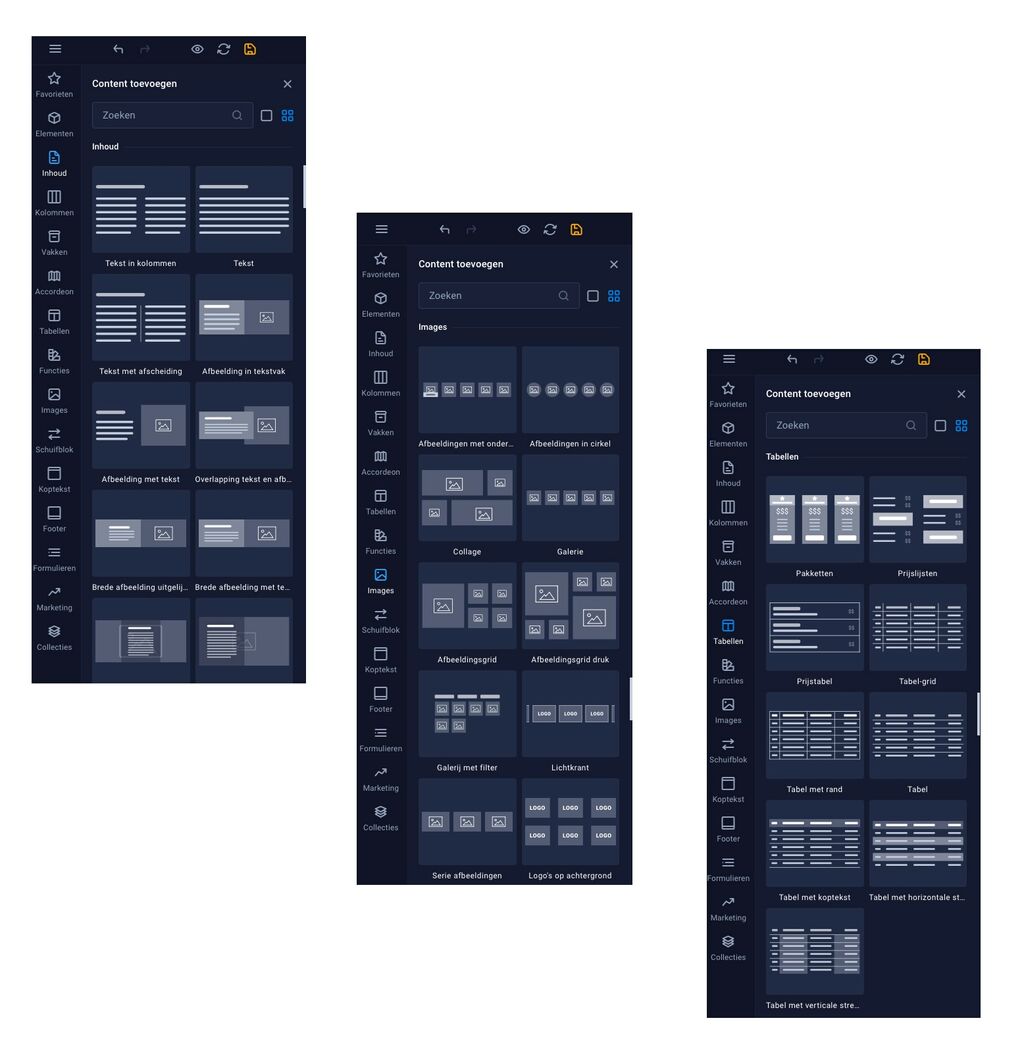 Je hebt de keuze uit honderden voorgedefinieerde bouwblokken, waardoor je snel en eenvoudig jouw website kunt vormgeven. Pas deze blokken volledig naar jouw eigen smaak aan, of het nu gaat om kleuren, lay-out of functionaliteiten.